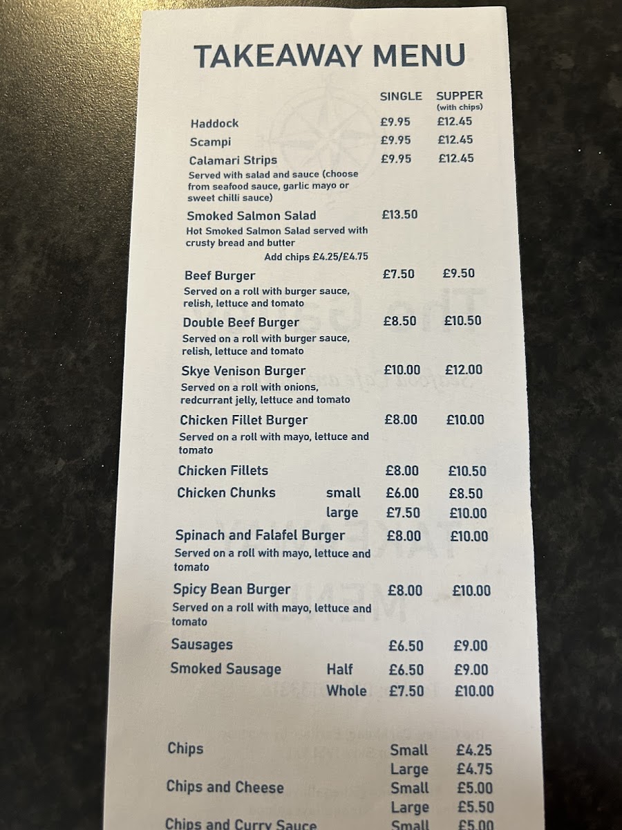 The Galley Cafe & Takeaway offers a straightforward and inviting menu that blends classic café fare with fresh local flavors. It’s the kind of place where you can enjoy comforting meals like fish and chips or a hearty Skye venison chilli burger, alongside lighter options such as smoked salmon salad or vegetable-based choices.